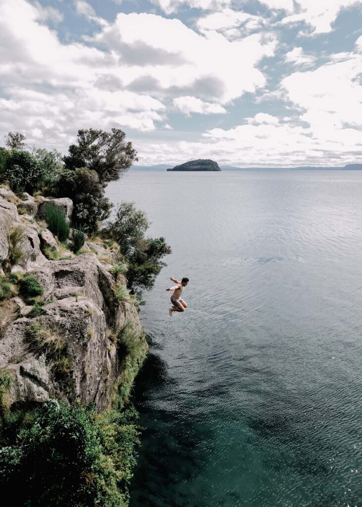 If you are looking for a beautiful viewpoint that provides a panoramic view of Lake Taupō and the surrounding mountains, Bulli Point is the perfect destination. It’s also one of our favourite rock jumping spots in the country. There are multiple spots to jump off into the lake at different heights as well as a rope swing. Bulli Point is a super popular spot during the summer months.